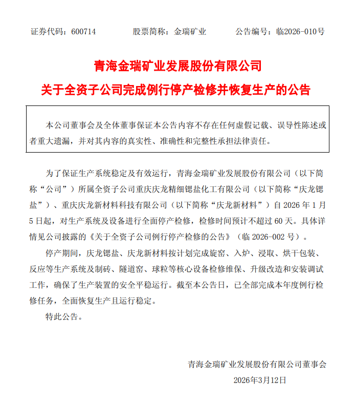 3月11日,金瑞矿业(600714.SH)公告称,公司所属全资子公司重庆庆龙精细锶盐化工有限公司、重庆庆龙新材料科技有限公司已完成生产系统及设备的全面停产检修,并恢复生产。检修期间,完成了旋窑、入炉、浸取、烘干包装、反应等生产系统及制砖、隧道窑、球粒等核心设备的检修维保、升级改造和安装调试工作。此次停产检修预计不超过60天,现已全面完成本年度例行检修任务。