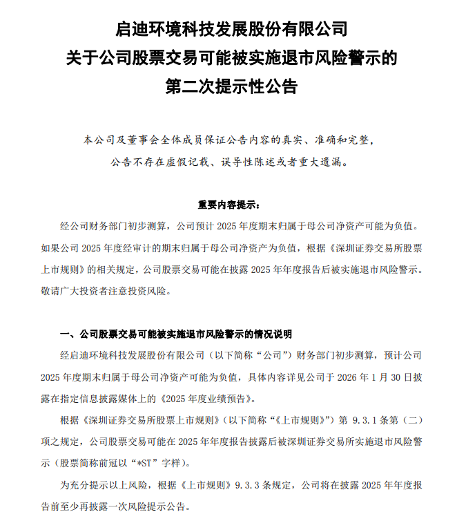 3月11日,启迪环境(000826.SZ)发布公司股票交易可能被实施退市风险警示的第二次提示性公告,经公司财务部门初步测算,公司预计2025年度期末归属于母公司净资产可能为负值。根据《深圳证券交易所股票上市规则》第9.3.1条第(二)项规定,若公司2025年度经审计的期末归属于母公司净资产为负值,公司股票交易将在披露2025年年度报告后被实施退市风险警示(股票简称前冠以“*ST”字样)。公司2025年年度报告审计工作仍在进行中,最终财务数据以正式披露的经审计报告为准。如触及退市风险警示情形,公司将在披露2025年年度报告的同时披露相关公告,股票于公告后停牌一个交易日,复牌之日起实施退市风险警示。