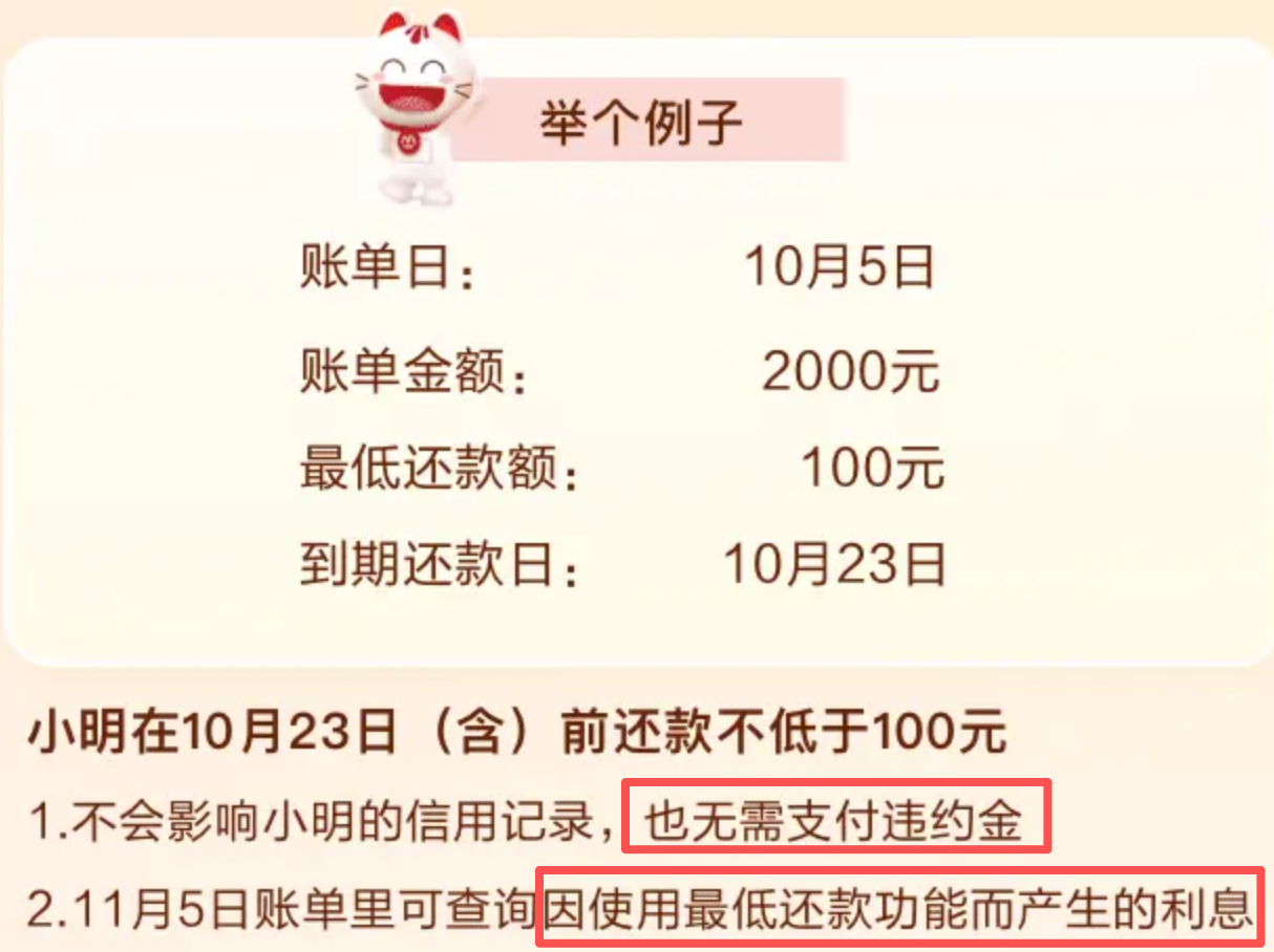 若持卡人在到期还款日(含)未还完“最低还款”,会收取“违约金”。“违约金”按最低还款额未还部分的5%计算,最低收取人民币10元。同时,当期所有消费从“记账日”开始计收利息日息万分之五,直到还清为止。需要强调的是,日利率0.05%,对应年化利率为18.25%。