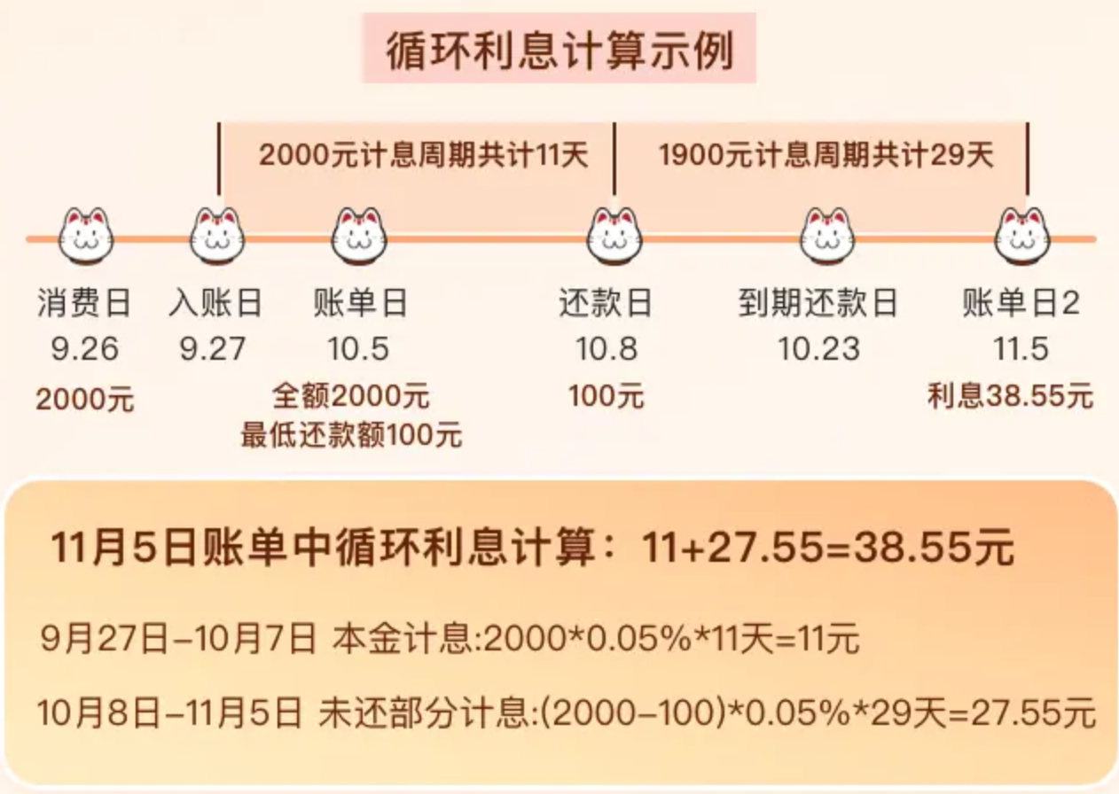 若在到期还款日(含)还完“最低还款”,则不收取“违约金”。但产生“循环利息”,其中循环利息包括本金计息、未还部分计息。