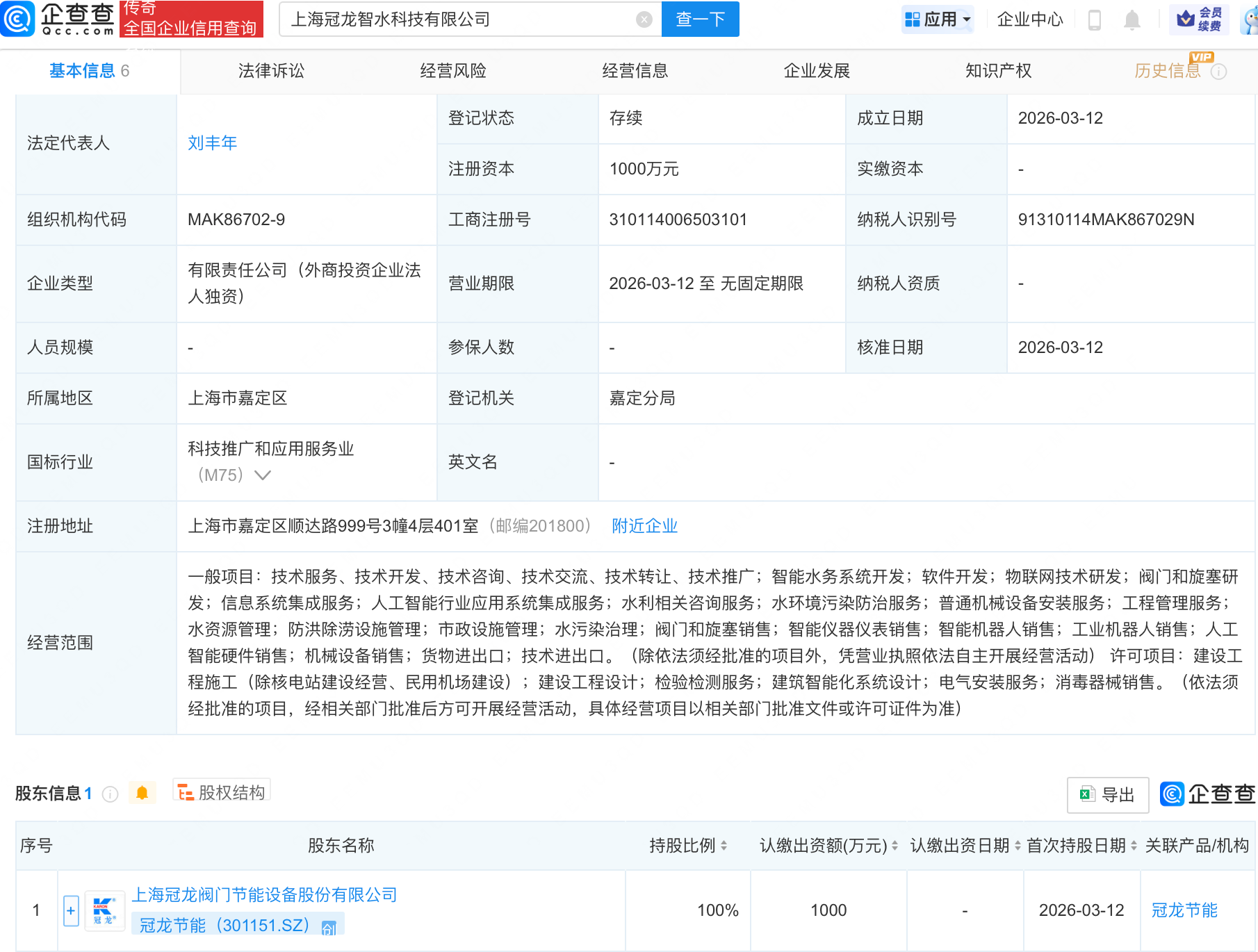 企查查APP显示,近日,上海冠龙智水科技有限公司成立,注册资本1000万元,经营范围包含:人工智能行业应用系统集成服务;智能机器人销售;工业机器人销售;人工智能硬件销售等。企查查股权穿透显示,该公司由冠龙节能(301151.SZ)全资持股。