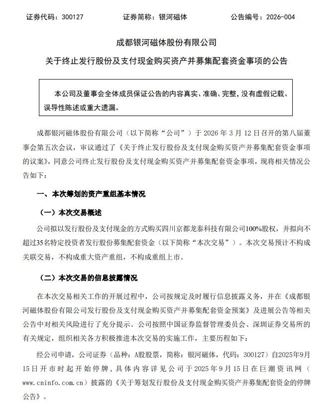 3月12日,银河磁体(300127.SZ)公告,公司原拟以发行股份及支付现金的方式购买四川京都龙泰科技有限公司100%股权。自本次交易预案披露以来,公司及相关各方有序推进和落实本次交易的各项工作,但由于公司与本次交易的交易对方就本次交易价格等部分核心条款未达成一致,公司经审慎研究后,决定终止本次交易。