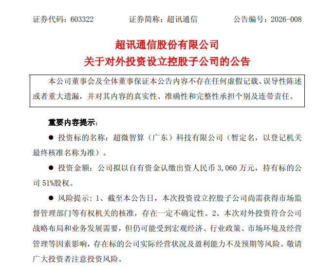 3月12日,超讯通信(603322.SH)公告称,公司拟与广东微云科技股份有限公司共同投资设立超微智算(广东)科技有限公司,公司拟以自有资金认缴出资人民币3060万元,持有标的公司51%股权。本次与合作方共同投资成立超微智算,旨在加快拓展公司在算力业务的布局,提升市场份额,符合公司增强转型的战略发展方向。