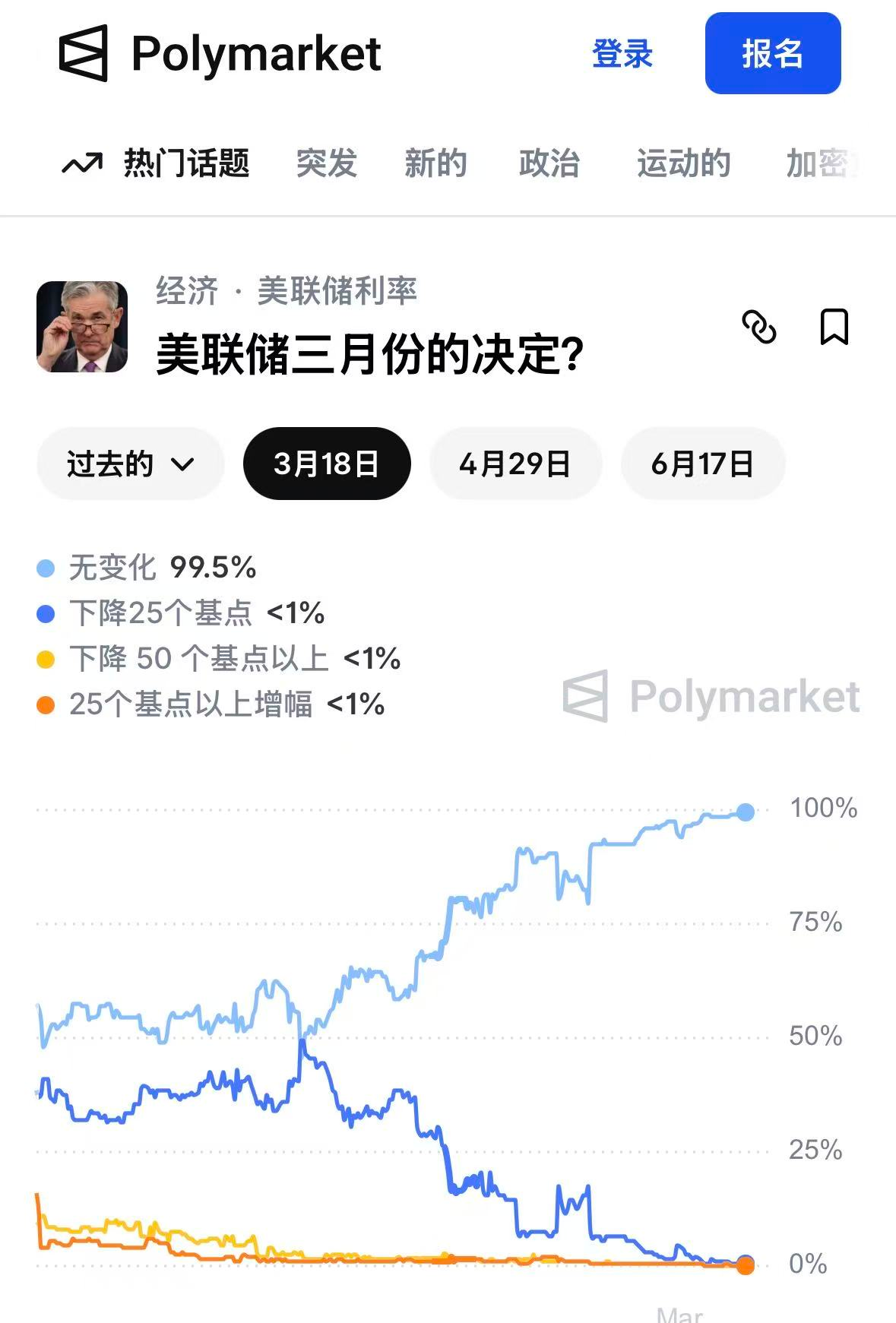 市场预测平台polymarket数据显示,美联储3月维持利率不变的概率高达99.5%,4月继续维持利率不变的概率高达92%,6月维持利率不变的概率为65%。