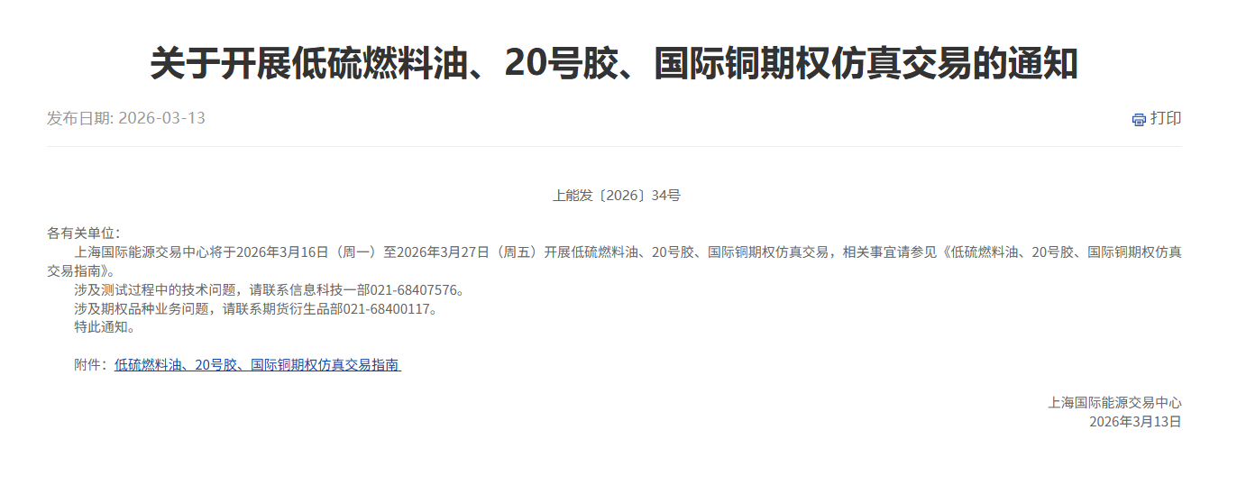 3月13日,上海国际能源交易中心发布通知称,将于2026年3月16日(周一)至2026年3月27日(周五)开展低硫燃料油、20号胶、国际铜期权仿真交易。