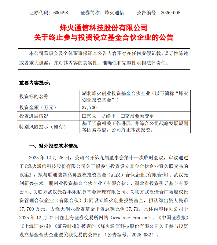 3月13日,烽火通信(600498.SH)公告称,此前,公司拟与联通战新私募股权投资基金(武汉)合伙企业(有限合伙)等共同设立烽火创业投资基金,公司拟认缴出资3.77亿元,占烽火创业投资基金出资总额比例37.7%。基于当前相关工作进展,并综合公司战略发展规划等因素考虑,经审慎研究并与交易对方友好协商,公司决定终止本次投资。截至本公告日,公司未实际出资,亦无需为本次终止该项投资承担任何责任或义务。