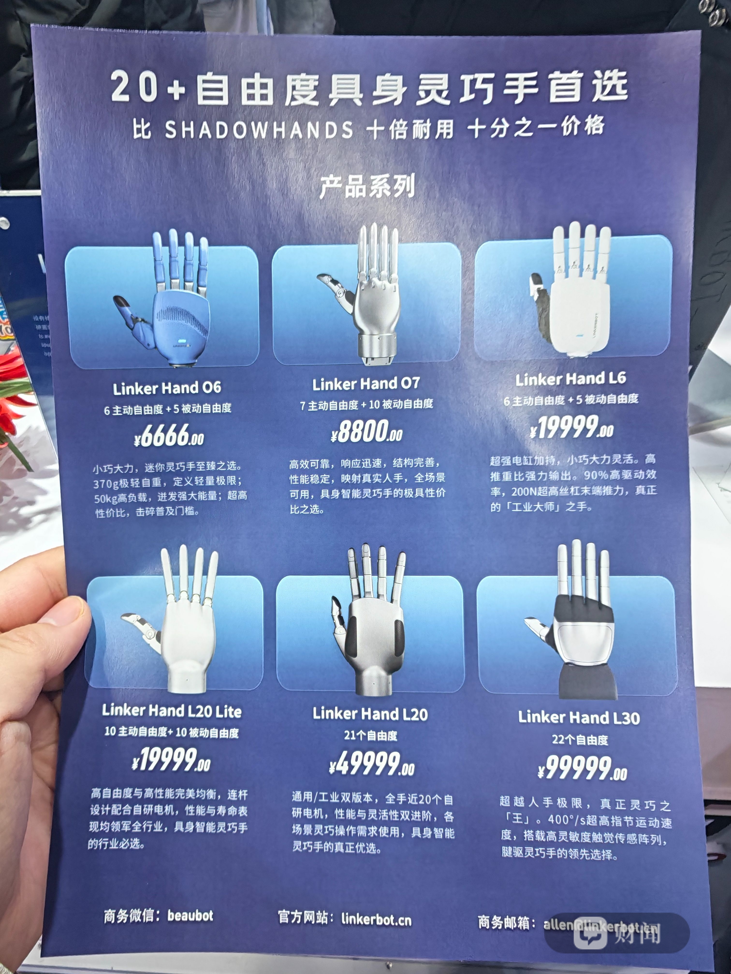 作为人形机器人价值量最高的零部件,灵巧手价格也居高不下。据灵心巧手提供的产品海报介绍,目前公司拥有多款20+自由度的灵巧手,其中有一款灵巧手售价高达99999元。