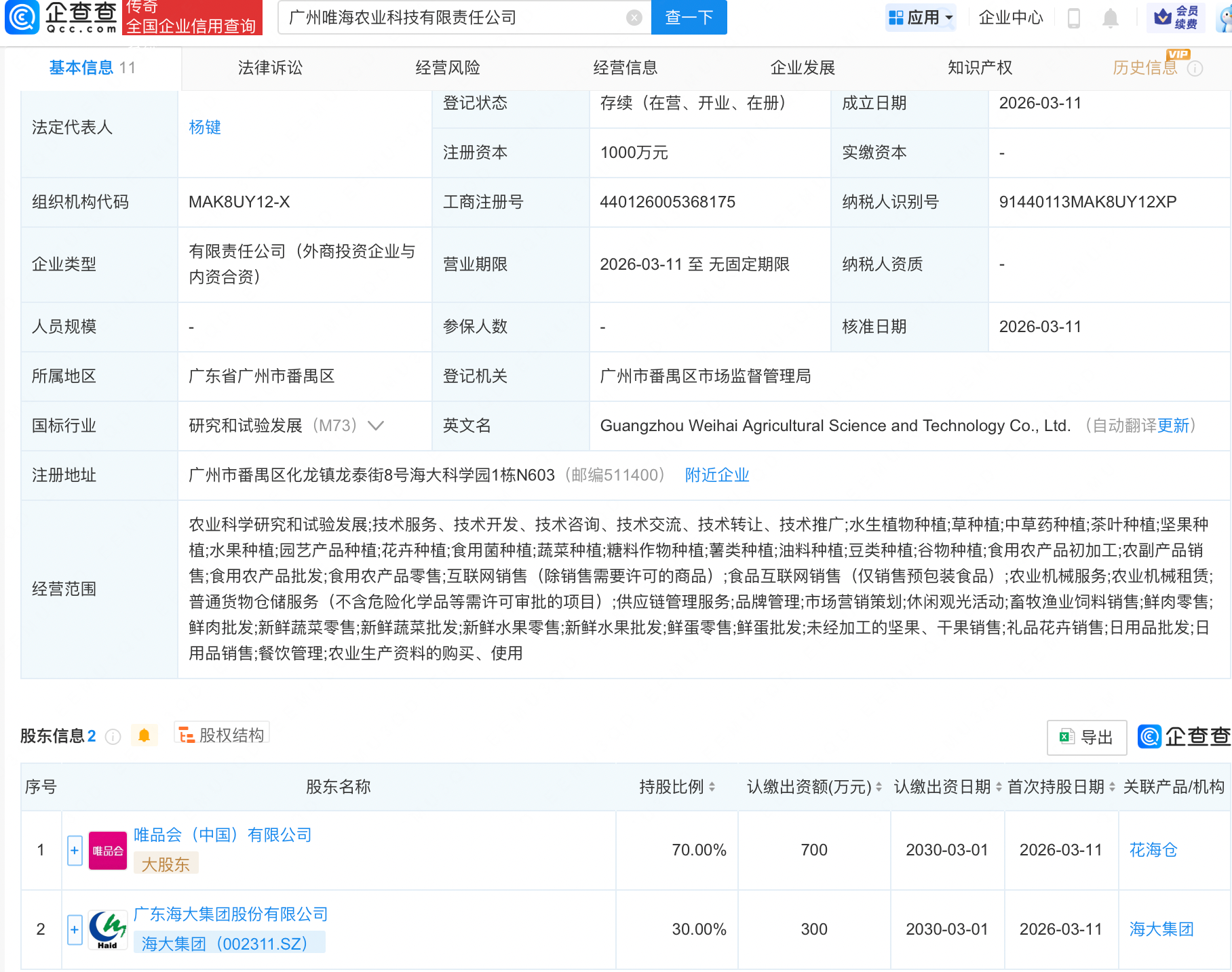 企查查APP显示,近日,广州唯海农业科技有限责任公司成立,经营范围包含:水生植物种植;草种植;中草药种植;茶叶种植等。企查查股权穿透显示,该公司由唯品会(中国)有限公司、海大集团(002311.SZ)共同持股。