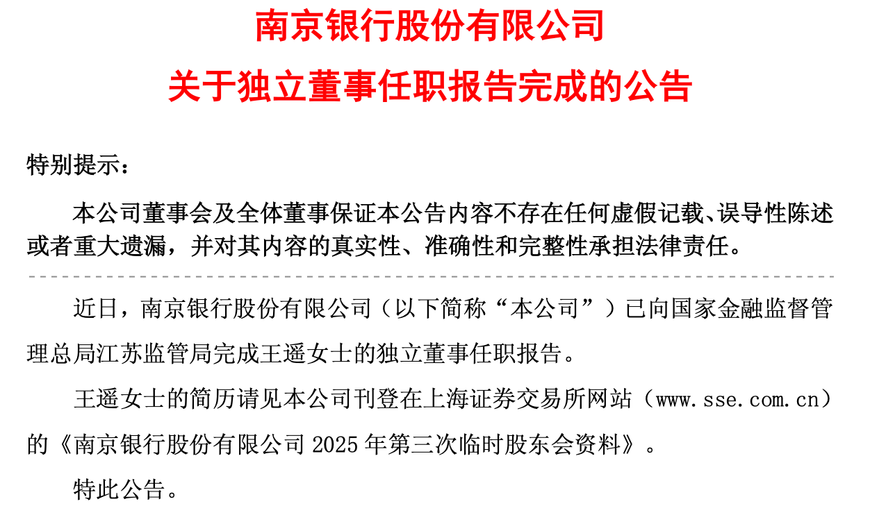 财闻向南京银行求证,对方表示,根据2025年6月发布的《银行业金融机构董事(理事)和高级管理人员任职资格管理办法》第16条,具有董事(理事)和高级管理人员任职资格且未连续中断任职一年以上的拟任人,在同质同类金融机构间平级调动(平级兼任)同类职务或改任(兼任)较低同类职务的,不需重新申请核准任职资格。金融机构应当在相关人员任职后十日内向监管机构报告。