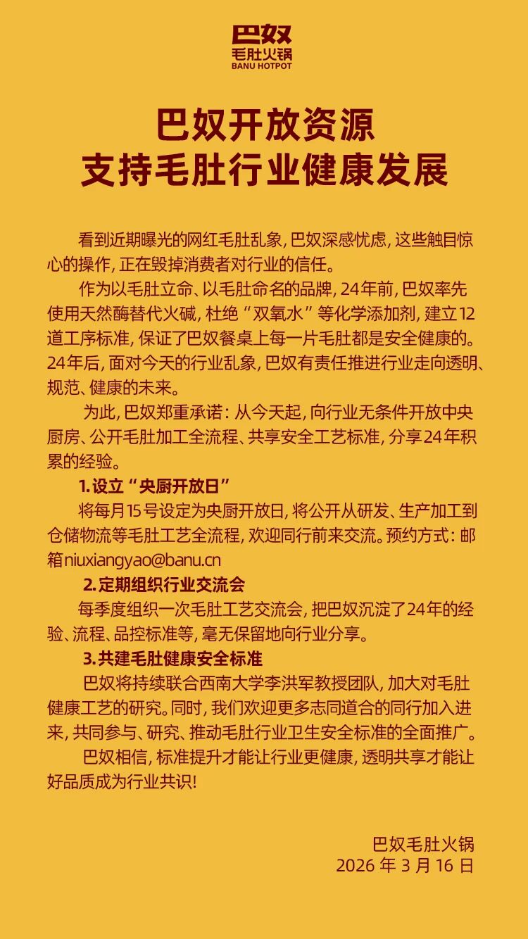 “巴奴毛肚火锅”微信公众号3月16日发布文章称,从今天起,向行业无条件开放中央厨房、公开毛肚加工全流程、共享安全工艺标准。