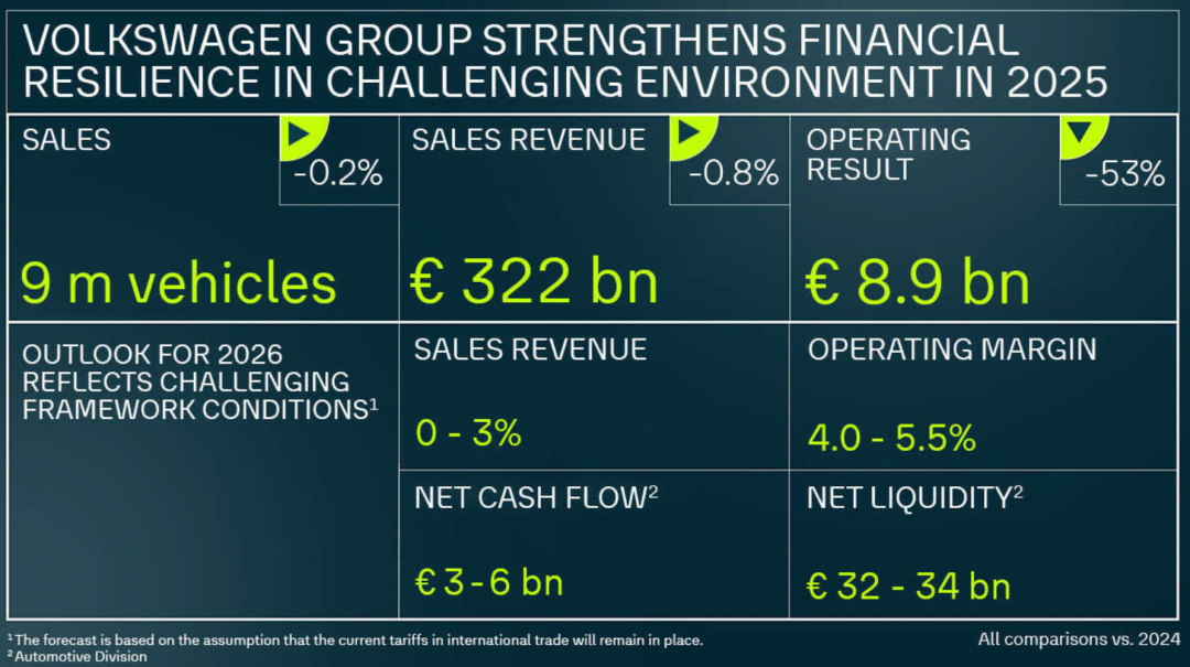 全球市场的寒意清晰体现在大众汽车2025财报的数据中。集团营业利润同比暴跌53%,仅录得89亿欧元(约合人民币711亿元),创下自2016年以来的最低水平。