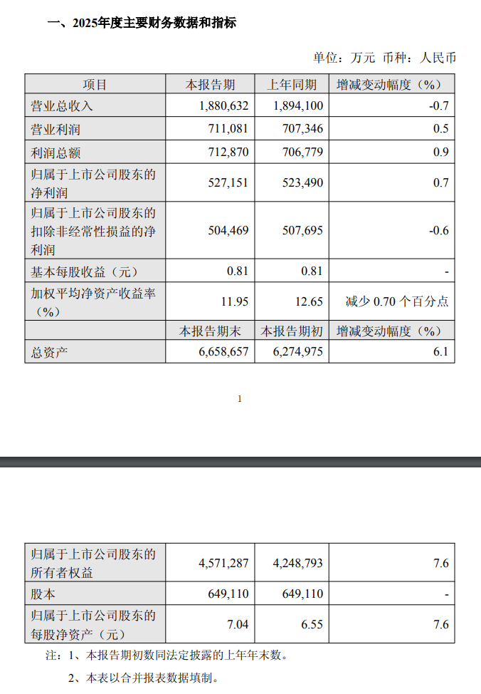 3月16日,青岛港(601298.SH)披露2025年年度业绩快报,公司全年营业收入188.06亿元,上年同期189.41亿元,同比降低0.7%;利润总额71.29亿元,上年同期70.68亿元,同比增长0.9%;归属于上市公司股东的净利润52.72亿元,上年同期52.35亿元,同比增长0.7%;归属于上市公司股东的扣除非经常性损益的净利润50.45亿元,上年同期50.77亿元,同比降低0.6%;基本每股收益0.81元,与上年同期持平。