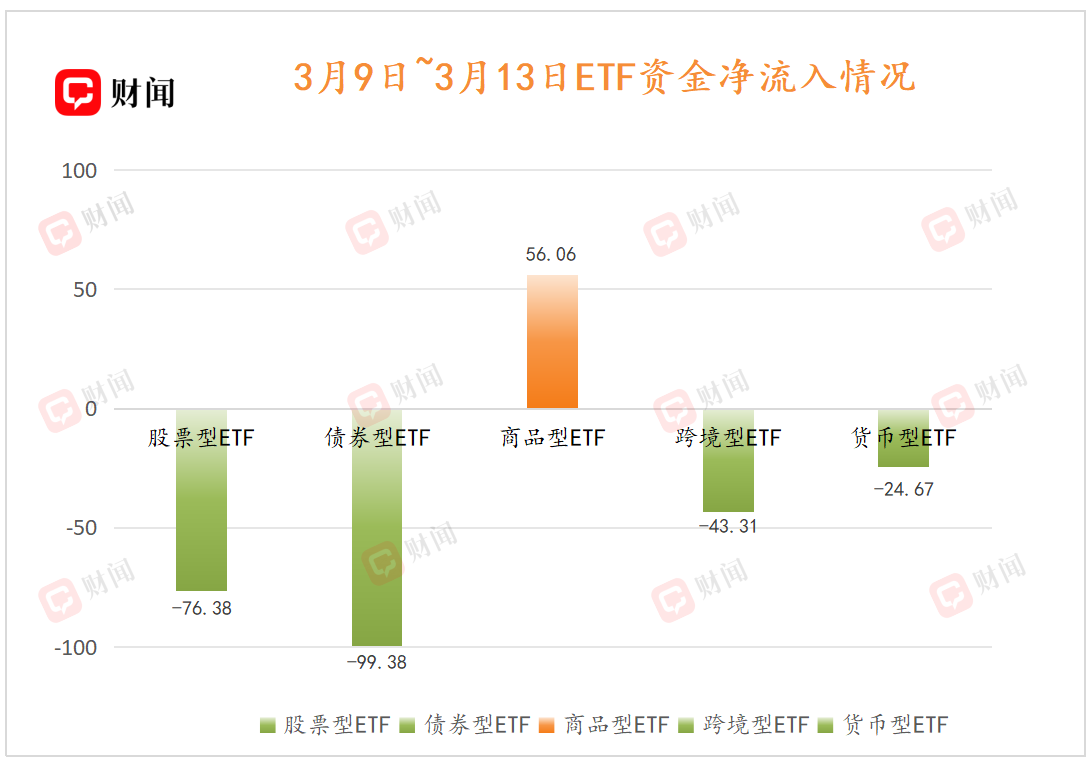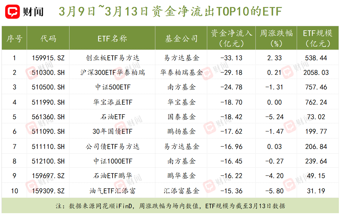 资金流出方面,宽基ETF未能扭转净赎回态势。创业板ETF易方达、沪深300ETF华泰柏瑞及南方基金的中证500ETF周净流出金额居前三位,分别为33.13亿元、29.18亿元和24.78亿元。