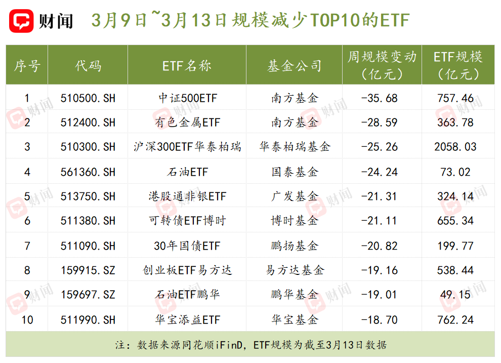 在规模缩减的产品中,南方基金旗下的中证500ETF周规模减小35.68亿元,是市场上唯一一只单周规模缩水超30亿元的ETF产品。