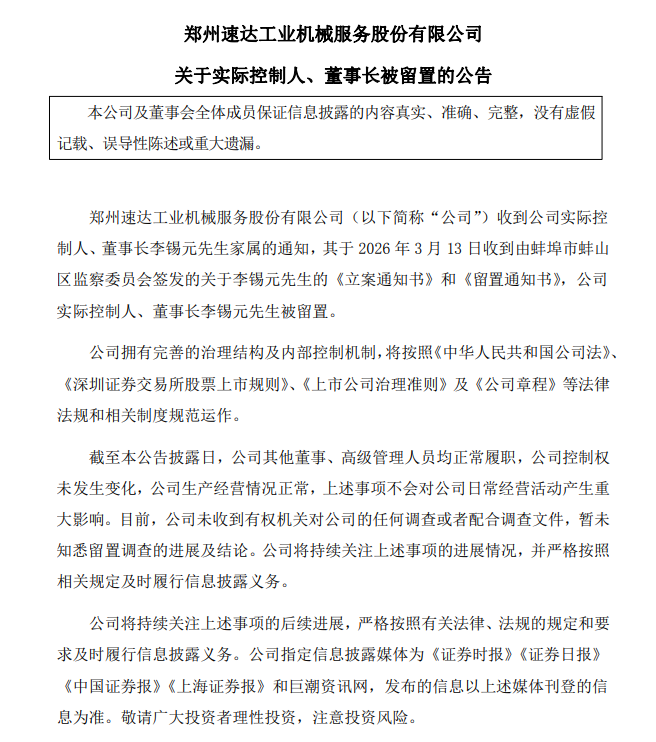 3月16日,速达股份(001277.SZ)公告,公司收到公司实际控制人、董事长李锡元家属的通知,其于2026年3月13日收到由蚌埠市蚌山区监察委员会签发的关于李锡元的《立案通知书》和《留置通知书》,公司实际控制人、董事长李锡元被留置。