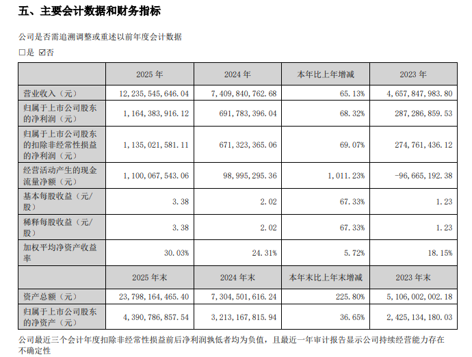 2025年实现营业收入122.36亿元,同比增长65.13%;归属于上市公司股东的净利润11.64亿元,同比增长68.32%。
