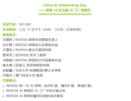 NVIDIA China AI Networking Day(英伟达中国人工智能网络日)将于北京时间3月17日下午14:00开启线上直播。本场线上活动将围绕下一代 AI 工作负载对超大规模网络、无限互连能力和全数据中心综合能效来展开,从 NVIDIA、业界领先客户、合作伙伴以及科研学者的角度来探讨领先的 NVIDIA® NVLink™、NVIDIA® Quantum-X InfiniBand、NVIDIA® Spectrum-X™ 以太网、NVIDIA® BlueField® DPU/SuperNIC™、NVIDIA® ConnectX® SuperNIC™ 网络平台及其最佳实践,特别是专为大规模 AI 而设计的 NVIDIA® Spectrum-X/XGS 以太网络及其相应的软、硬件优化参考设计如何助力 AI 工厂实现数百万级 GPU 的无缝扩展,缩短部署时间,并优化整体性能和功耗。