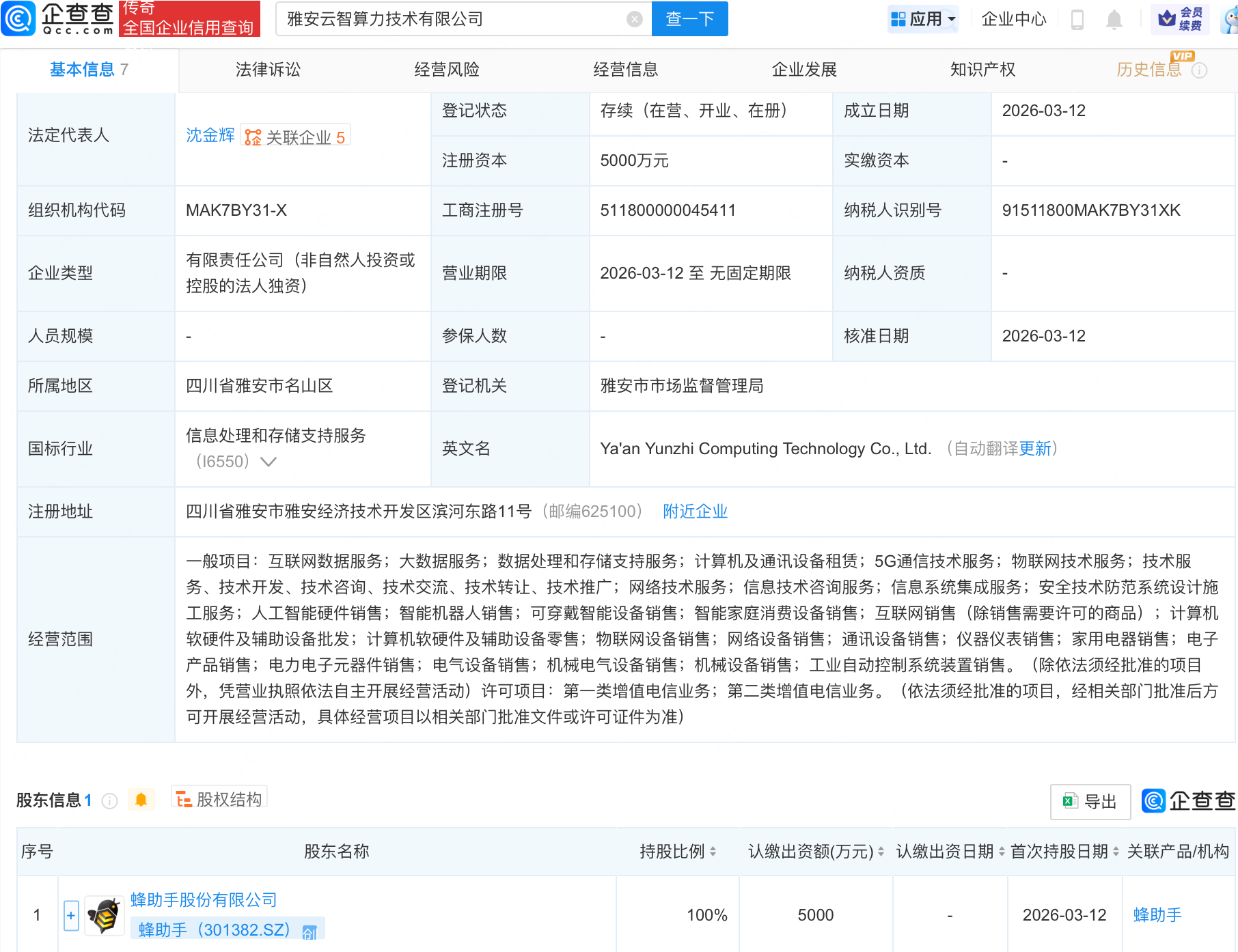 企查查股权穿透显示,该公司由蜂助手(301382.SZ)全资持股。