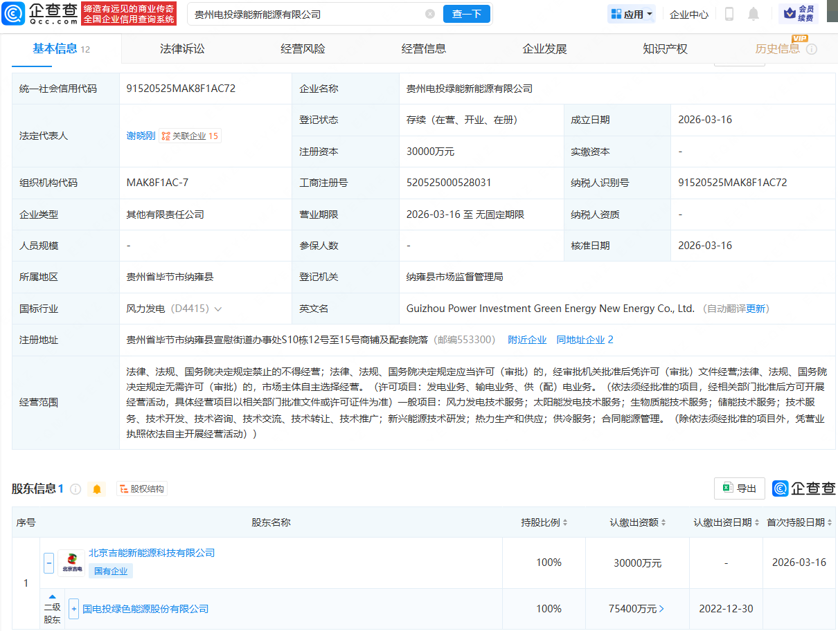 企查查APP显示,近日,贵州电投绿能新能源有限公司成立,法定代表人为谢晓刚,注册资本为3亿元,经营范围包含:发电业务、输电业务、供(配)电业务;太阳能发电技术服务;生物质能技术服务;储能技术服务等。企查查股权穿透显示,该公司由电投绿能间接全资持股。