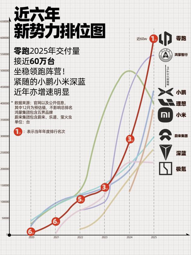 2025年,零跑交出了一份令行业侧目的销量答卷:全年交付59.7万台,同比增长103.1%,连续两年实现销量翻倍,一举夺得新势力品牌销冠。 更值得一提的是,零跑不仅是国内卖得好,更是中国新势力出海的领头羊——全年出口超6.7万台,位列新势力出海榜第一。