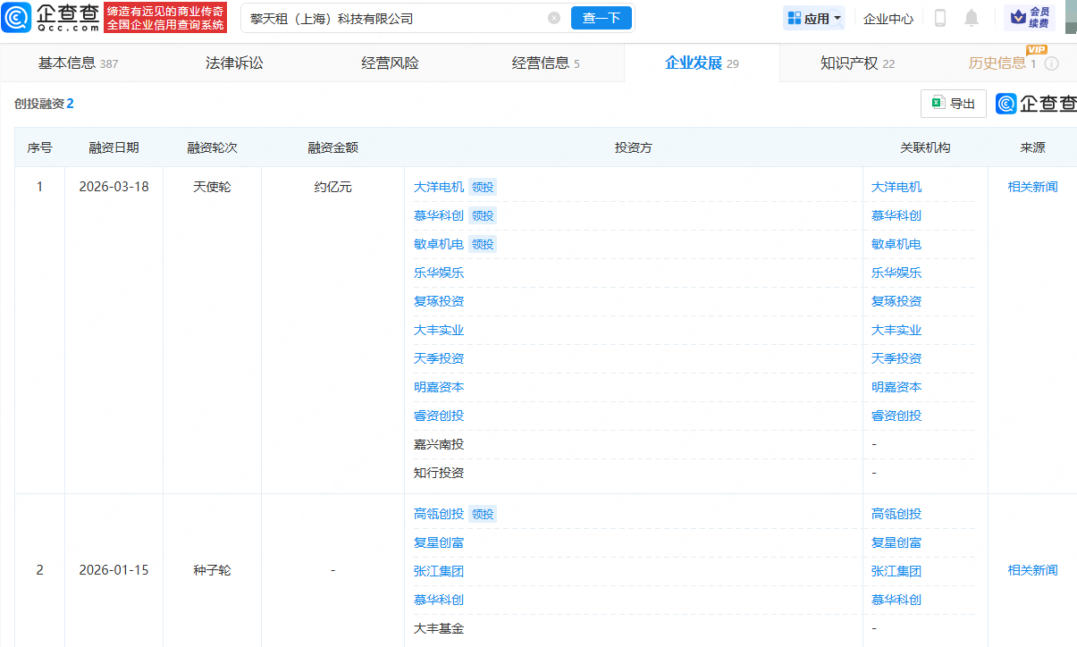 擎天租宣布完成天使轮及天使+轮两轮融资,天使轮及天使+轮融资由大洋电机(002249.SZ)、慕华科创、敏卓机电等领投,乐华娱乐(02306.HK)、复琢投资等跟投。