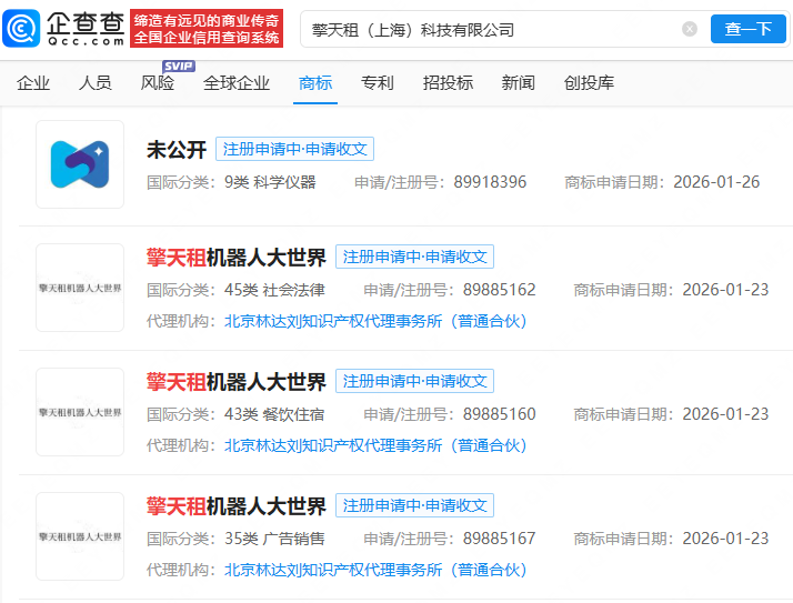 擎天租系全球首个机器人租赁平台,企查查显示,擎天租(上海)科技有限公司成立于2025年12月,注册资本1000万元,现由智元创新(上海)科技股份有限公司、智元擎天(上海)科技合伙企业(有限合伙)等共同持股。目前,擎天租已申请注册多个“擎天租机器人大世界”商标。