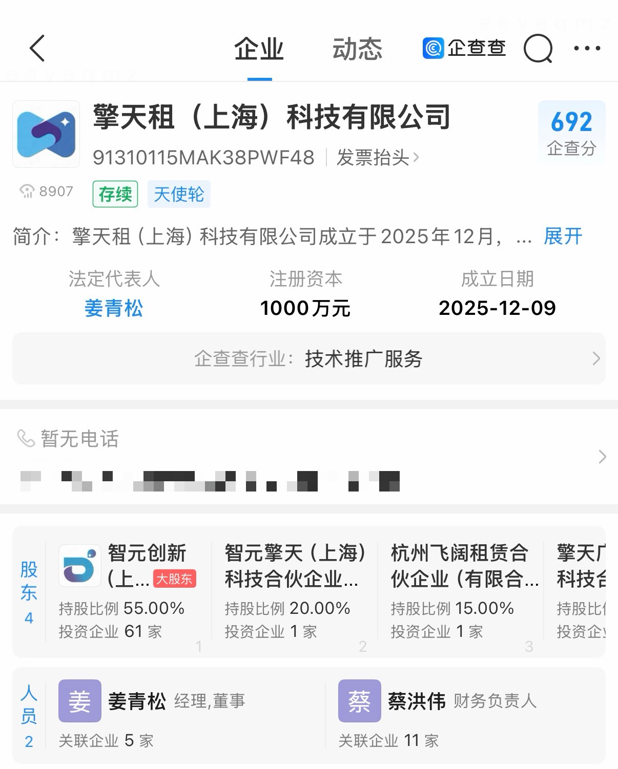 擎天租系全球首个机器人租赁平台,企查查显示,擎天租(上海)科技有限公司成立于2025年12月,注册资本1000万元。
