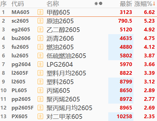 原油期货主力合约高开4.81%,随后快速拉升,一度涨超7%。此外,甲醇、燃油、沥青等油化相关期货涨幅居前。