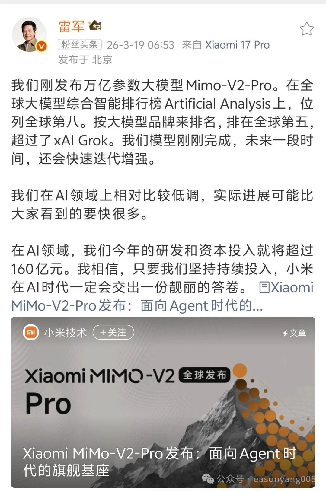 雷军在微博表示,我们刚发布万亿参数大模型Mimo-V2-Pro。在全球大模型综合智能排行榜Artificial Analysis上,位列全球第八。按大模型品牌来排名,排在全球第五,超过了xAIGrok。我们模型刚刚完成,未来一段时间,还会快速迭代增强。我们在AI领域上相对比较低调,实际进展可能比大家看到的要快很多。在AI领域,我们今年的研发和资本投入就将超过160亿元。我相信,只要我们坚持持续投入,小米在AI时代一定会交出一份靓丽的答卷。