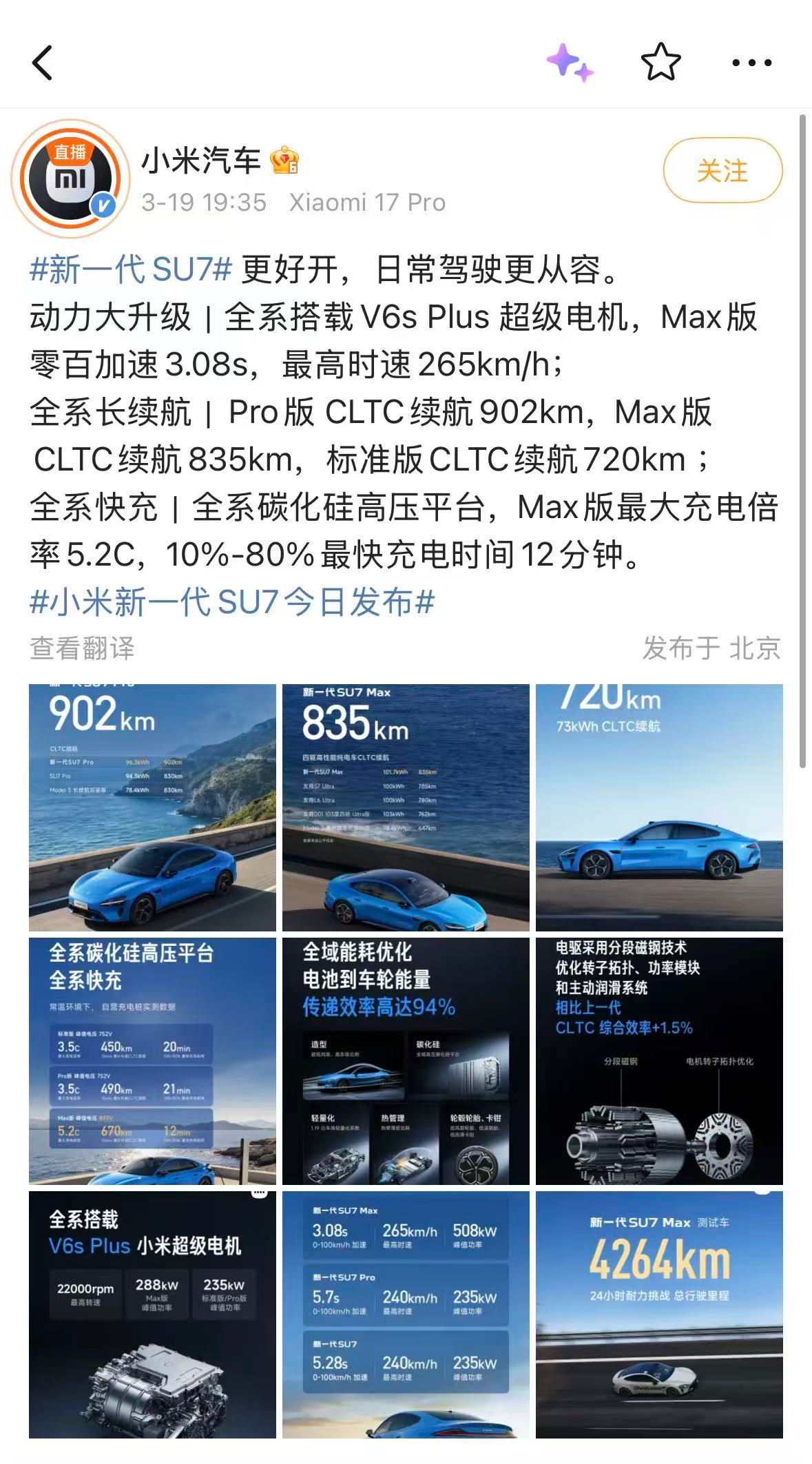 3月19日,据小米汽车微博消息,新一代SU7全系搭载V6s Plus 超级电机,Max版零百加速3.08s,最高时速265km/h;全系长续航,Pro版 CLTC续航902km,Max版CLTC续航835km,标准版CLTC续航720km;全系快充,全系碳化硅高压平台,Max版最大充电倍率5.2C,10%~80%最快充电时间12分钟。