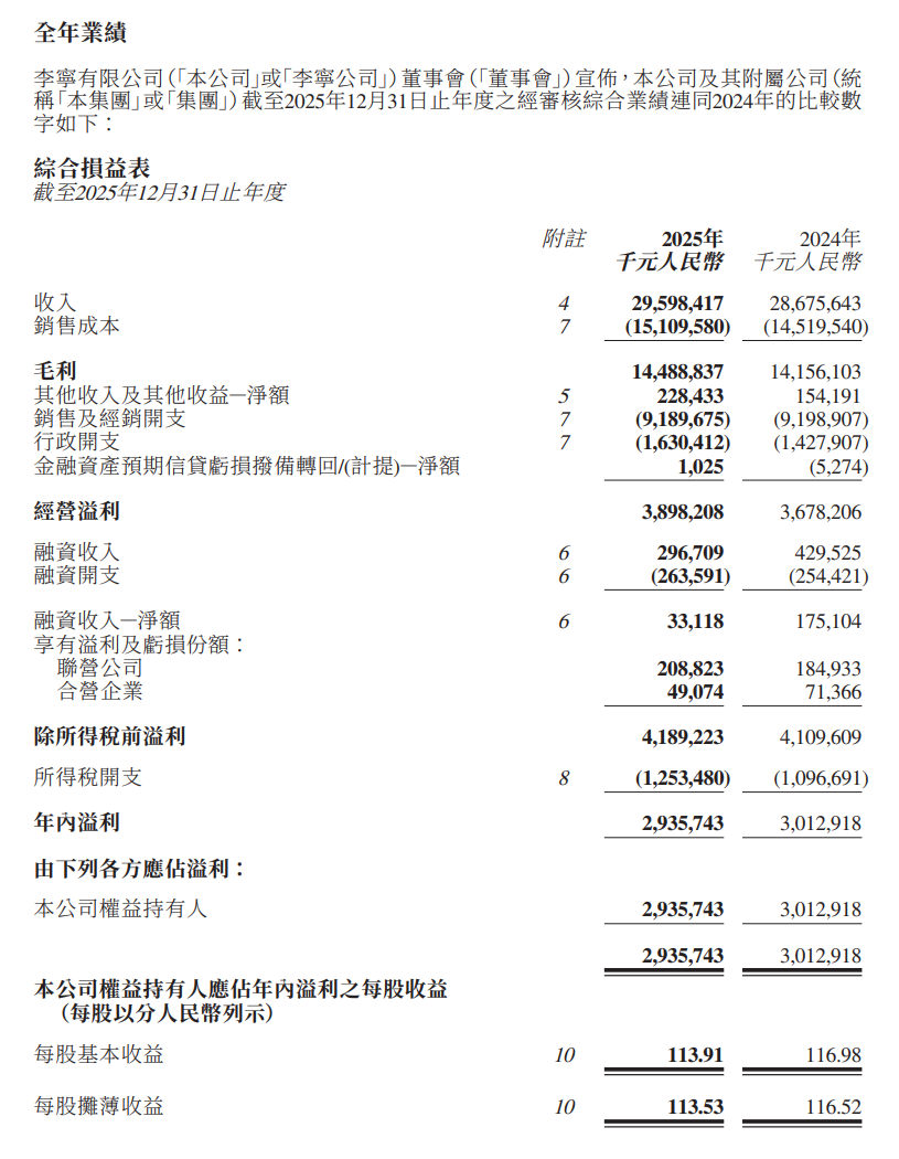 3月19日,李宁(02331.HK)发布2025年业绩报告。公司全年营收296.0亿元,同比增长3.2%;年内溢利29.4亿元,同比略微下降;每股末期股息0.2336元。