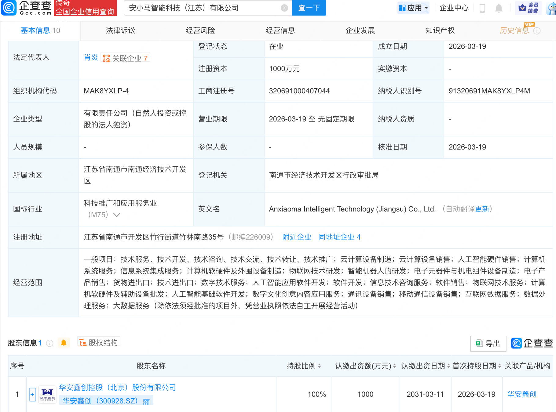 企查查APP显示,近日,安小马智能科技(江苏)有限公司成立,注册资本1000万元,经营范围包含:物联网技术研发;智能机器人的研发;人工智能应用软件开发;软件开发等。企查查股权穿透显示,该公司由华安鑫创(300928.SZ)全资持股。