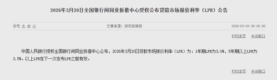 3月20日,央行发布公告显示,2026年3月贷款市场报价利率(LPR)报价出炉:1年期LPR为3%,上月为3%;5年期以上LPR为3.5%,上月为3.5%。