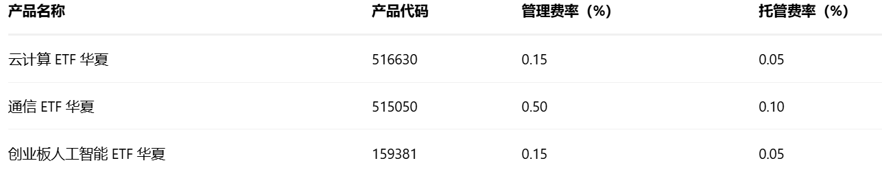 费用重要提示:以上所提及ETF均不收取申购费、赎回费、销售服务费。申购赎回代理机构可按照不超过0.5%的标准收取佣金,其中已包含证券交易所、登记结算机构等收取的相关费用。此外,相关ETF的管理费率和托管费率均从基金资产中扣除,具体费率如下表所示。