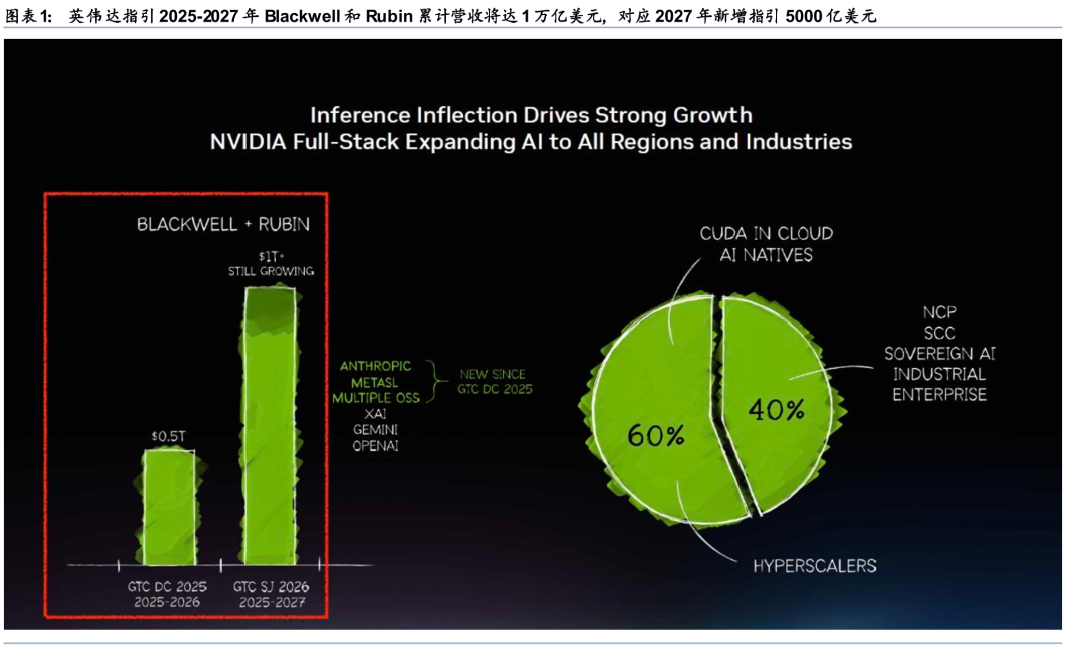 其一,需求端指引大幅超预期,黄仁勋明确表示,截至当前,到2027年可看到至少1万亿美元的高确信度算力相关采购需求,大超市场预期,直接打消了市场对AI算力需求增速放缓的担忧;