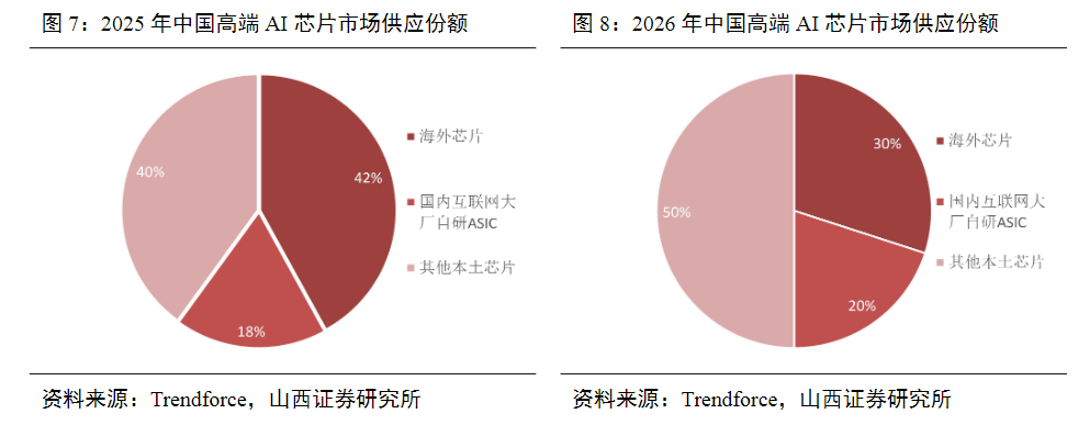 根据 Trendforce 预测,2026年国产 AI 芯片(包括国内互联网大厂自研的 ASIC 芯片和本土芯片供应商的产品)在国内高端 AI 芯片市场的供应份额将达到70%,而英伟达(NVDA.US)H200、AMD MI325等同级海外产品的份额仅为30%。