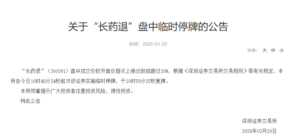 3月20日,深交所发布关于“长药退”盘中临时停牌的公告,“长药退”(300391)盘中成交价较开盘价首次上涨达到或超过30%,根据《深圳证券交易所交易规则》等有关规定,本所自今日10时48分24秒起对该证券实施临时停牌,于10时58分25秒复牌。