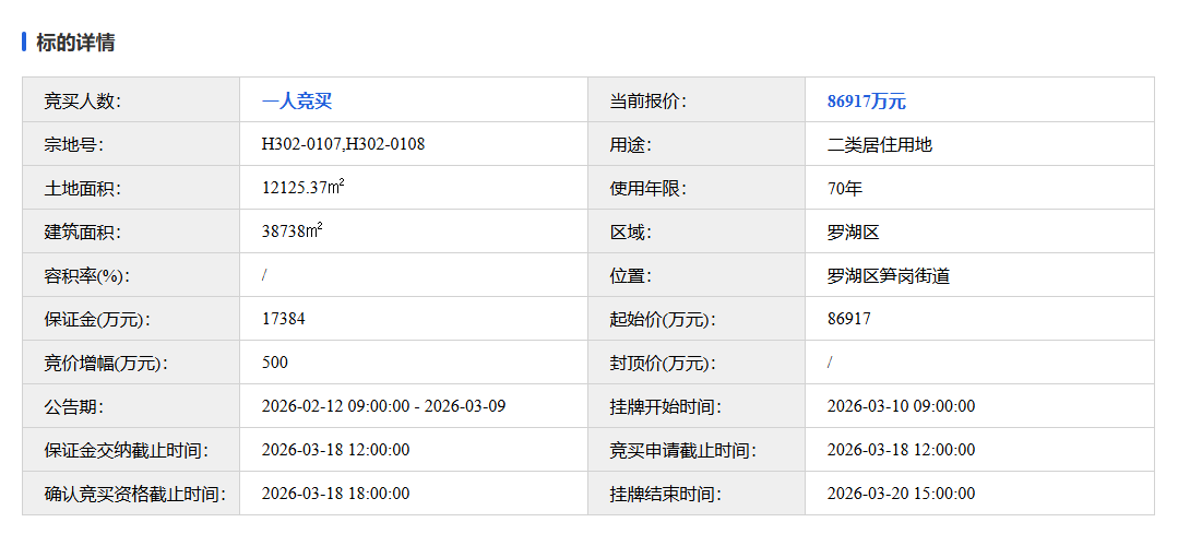 3月20日,深圳迎来2026年首场宅地土拍,本次仅1宗罗湖区笋岗街道涉宅用地出让,最终深铁以总价8.69亿元斩获地块,成交楼面价22437元/㎡,溢价率0%。