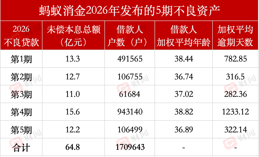蚂蚁消金年内发布了5期个人不良贷款(个人消费贷款)项目转让公告,合计未偿本息总额64.8亿元,借款人加权平均年龄集中在36、37、38岁,加权平均逾期时长1年到3年不等,借款人户数合计有171万户。