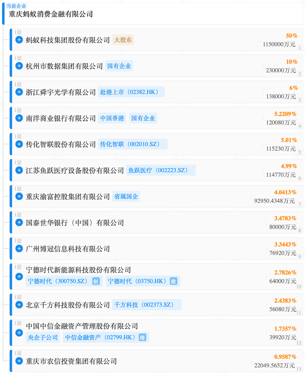 企查查数据显示,蚂蚁消金2021年成立,位于重庆,蚂蚁科技集团股份有限公司持有蚂蚁消金50%的股份,为第一大股东。该公司董事长金晓龙同时是蚂蚁消金、浙江网商银行股份有限公司的最终受益人。