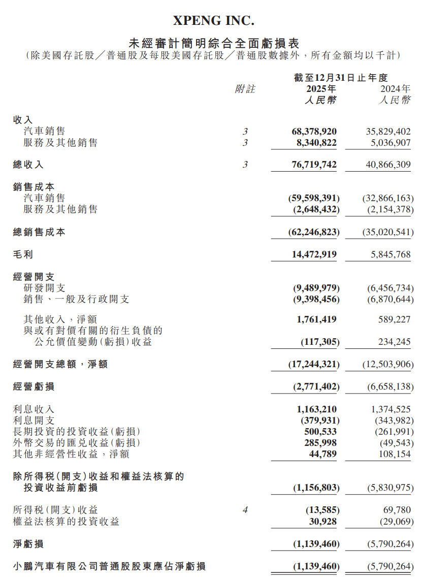 财务方面,小鹏汽车2025年全年总收入为人民币767.2亿元(约合106.2亿美元),较2024年的408.7亿元增长87.7%。其中汽车销售收入为人民币683.8亿元(约合94.7亿美元),同比增长90.8%。毛利率提升至18.9%,而2024年为14.3%;汽车毛利率为12.8%,较2024年的8.3%显著改善。
