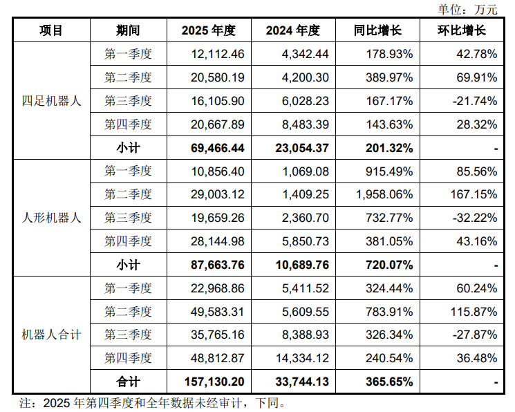根据申报稿,宇树科技四足机器人和人形机器人 2025 年分季度的营业收入情况如下:
