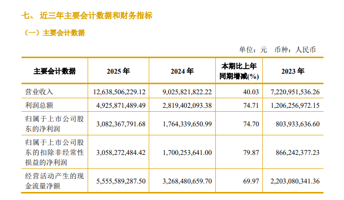 2025年公司实现营业收入126.39亿元,同比增长40.03%,实现归属股东净利30.82亿元,同比增长74.7%。