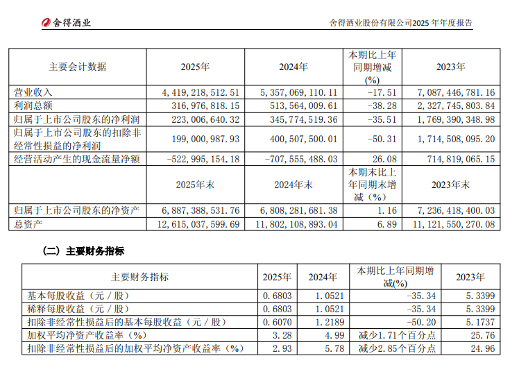 3月20日,舍得酒业(600702.SH)发布2025年度报告,公司2025年营业收入44.19亿元,同比下降17.51%;归属于上市公司股东的净利润2.23亿元,同比下降35.51%;基本每股收益0.6803元。公司拟每10股派发现金红利3.1元(含税)。