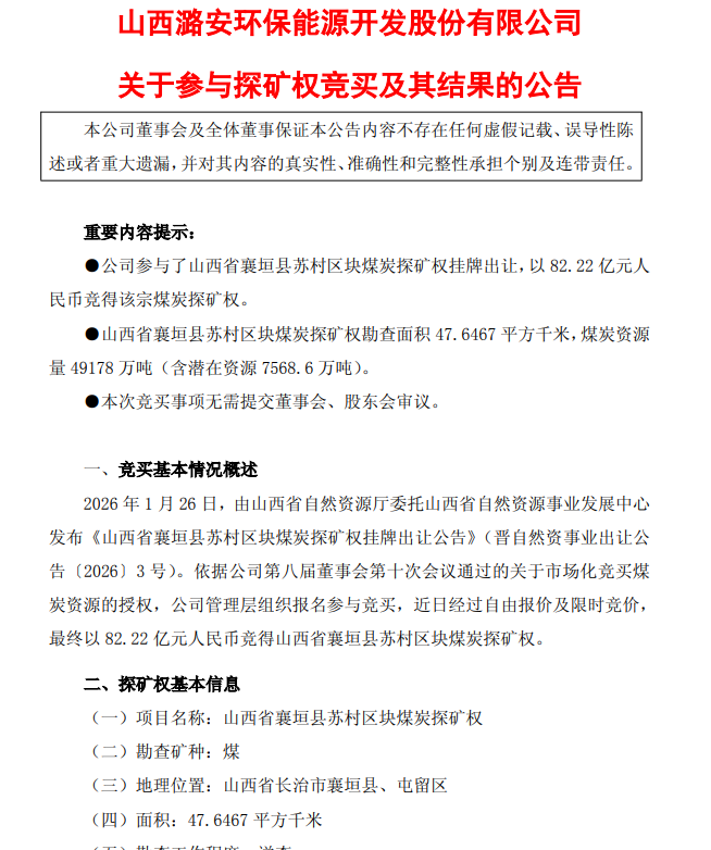 潞安环能:以82.22亿元竞得襄垣县苏村区块煤炭探矿权