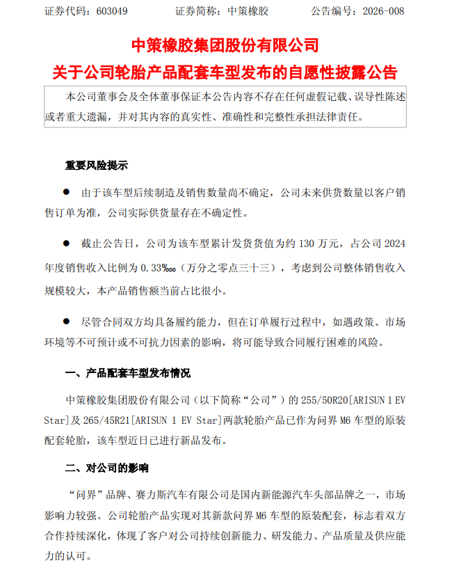 3月23日,中策橡胶(603049.SH)公告,公司的255/50R20[ARISUN1EVStar]及265/45R21[ARISUN 1 EV Star]两款轮胎产品已作为问界M6车型的原装配套轮胎,该车型近日已进行新品发布。