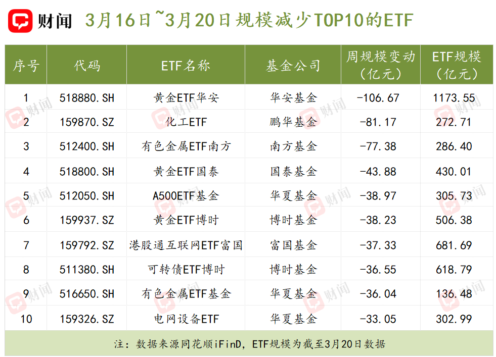 在上周规模大幅减少的产品中,黄金ETF华安首当其冲。上周在其净值回撤7.93个百分点情况下,其规模缩水了106.67亿元,截至3月20日,规模降至1173.55亿元。