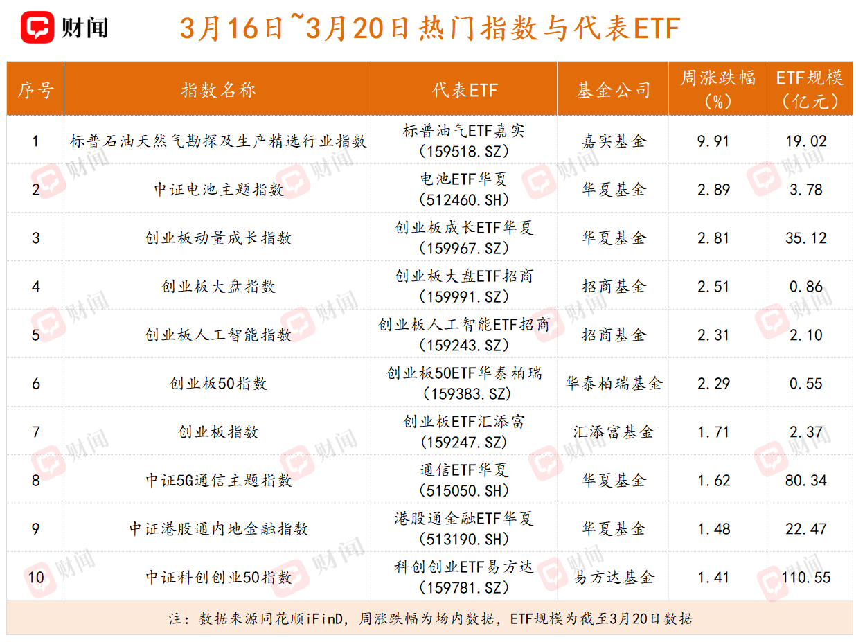 受市场调整拖累,上周ETF整体表现疲软,超八成产品录得下跌。在少数逆势上涨的品种中,标普油气类ETF领涨全场,紧随其后的是创业板系列ETF,如创业板成长ETF华夏及创业板大盘ETF招商等涨幅超2%。