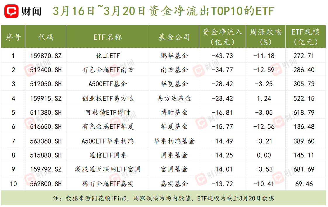 此外,在净值回撤和资金净流出的双重挤压下,鹏华基金的化工ETF与有色金属ETF南方规模分别缩减81.17亿元和77.38亿元,截至3月20日,规模分别降至272.71亿元和286.40亿元。