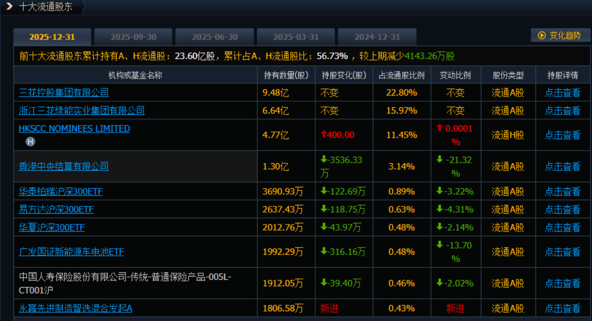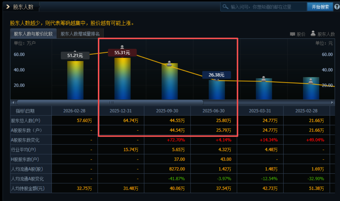 此外,数据显示,截至2025年12月31日,公司前十大流通股东累计持有A、H流通股23.60亿股,占流通股比例为56.73%。相较于2025年6月30日的数据(累计持有23.57亿股,占比57.68%),虽然持股总数微幅上升,但占流通股比例下降了近1个百分点。截至2025年12月31日,公司股东总人数达64.74万户,较2025年6月30日的25.80万户激增154.03%。这一结构性变化共同指向一个明确信号——筹码正从机构向散户快速转移,股权集中度显著下降。